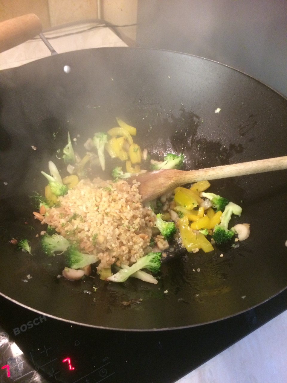 - While the fish and the grains are cooking, heat up a wok or large frying pan to a medium/high heat with the rest of the olive oil and garlic.