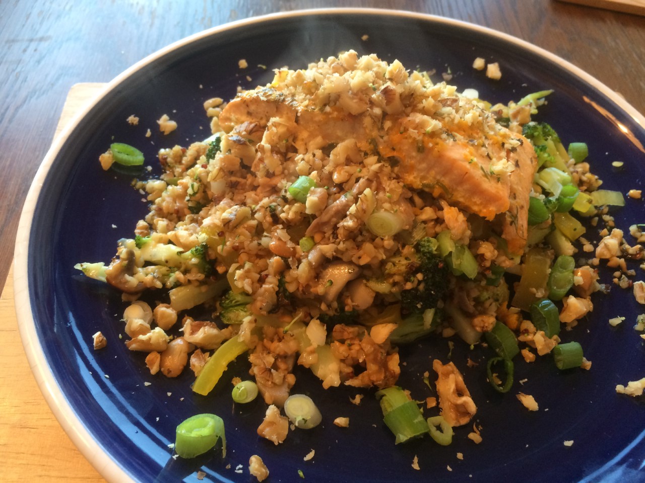 - Just before serving, stir in the spring onions, then pour the mixture onto a plate, place the salmon on top (check it’s cooked all the way through first, cooking times depend on the size and thickness of the fillet) and then sprinkle the walnuts on top.