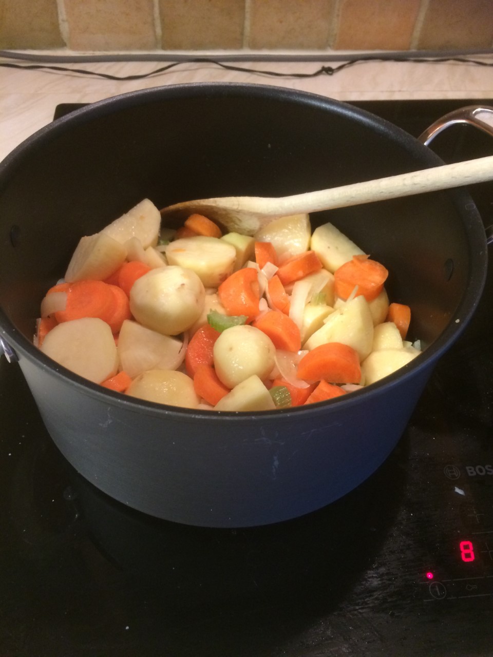 - When the onion is sizzling add the other veg and cook for 5 mins, stirring every so often so they don’t stick to the bottom of the pan.