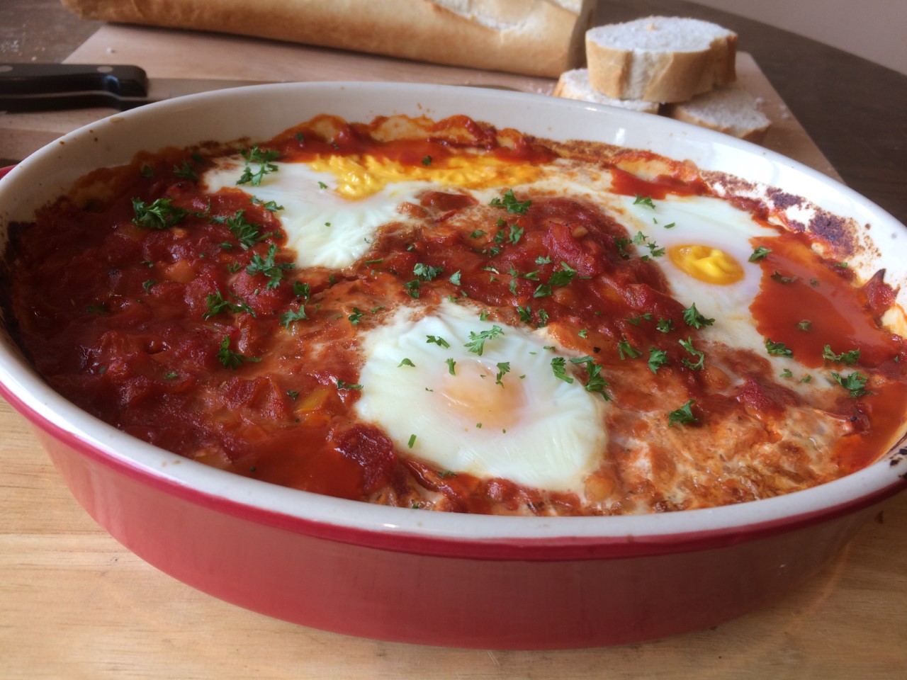 A few years ago I watched a film (can’t remember what it was called now) where one of the characters cooked a dish called Eggs In Hell – a spicy tomato based dish with eggs cooked into it. So to save the bickering and hot oil burns, I thought I’d give it a go as the veggie option for the next in-law visit, and free up the hob for the husband to fry the sausages and bacon. It went down a storm and was commented on for days after.