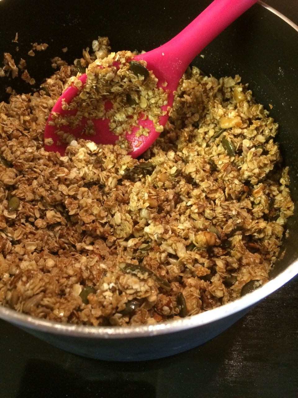 - Add the oats, nuts, seeds and the rest of the honey and mix well. – Pic 4