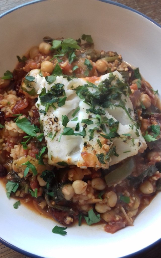 For once, my first attempt at a new recipe worked. Usually it takes a couple of goes to get it right, but this just came together (thanks to the lovely fish and pre-mixed spices). It’s delicious, warming without being spicy and really easy to make. I haven’t added any sugars, salts or fats into this dish, just a bit of olive oil to stop the veg sticking to the pan and the fish and pulses are really good sources of iron, so it’s healthy too.