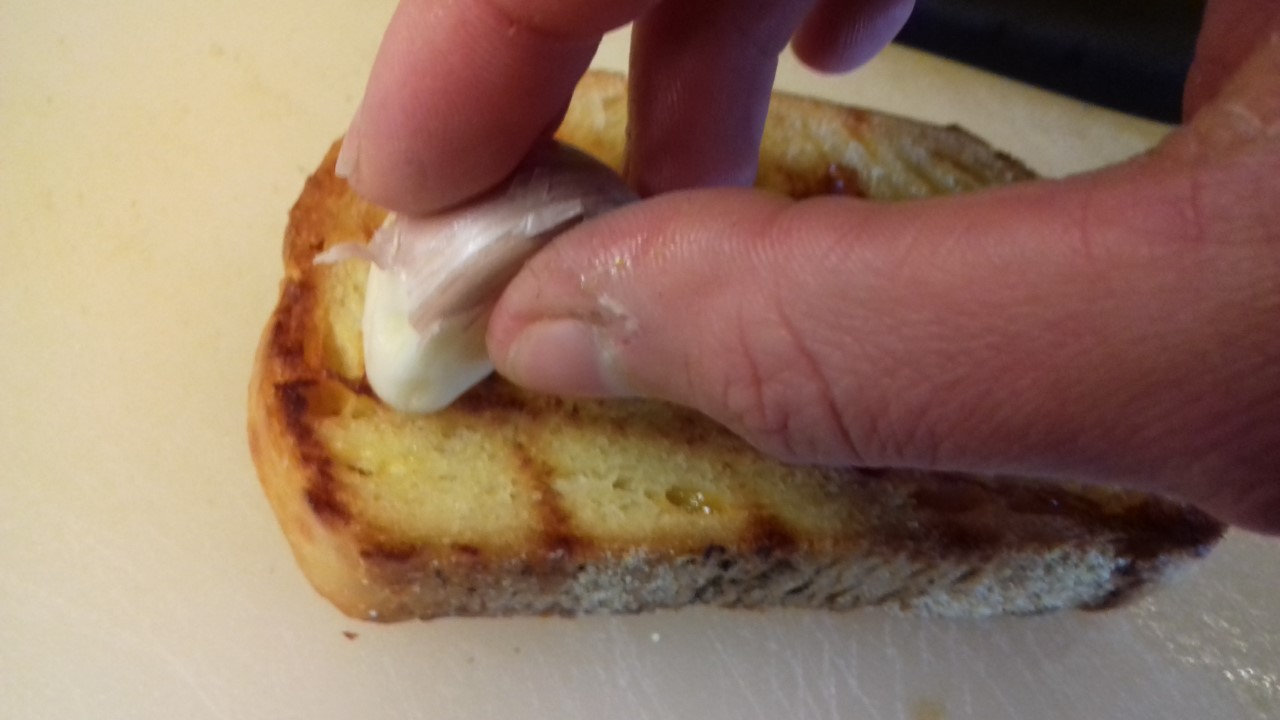 - Peel the garlic clove and rub the raw garlic over the toasted bread, making sure you rub right to the edge for an even flavour. The garlic will be grated onto the bread and warm through as you’re doing it. – Pic 4