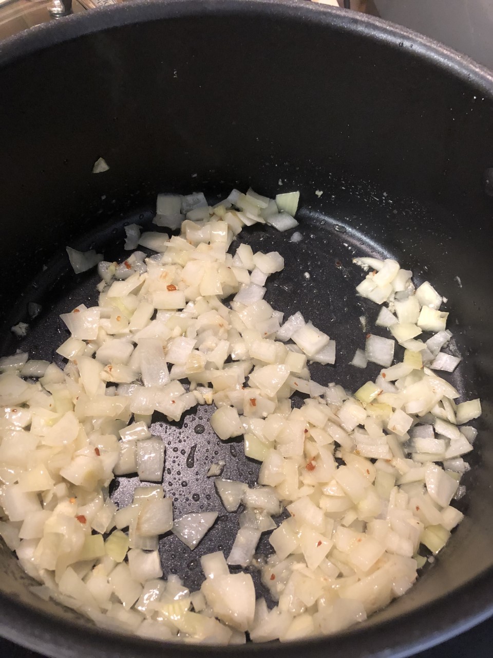 - Put the olive oil, onion, garlic and chilli flakes in a large pan over a medium/high heat and let it sizzle for 2 mins until soft but not browned. – Pic 1