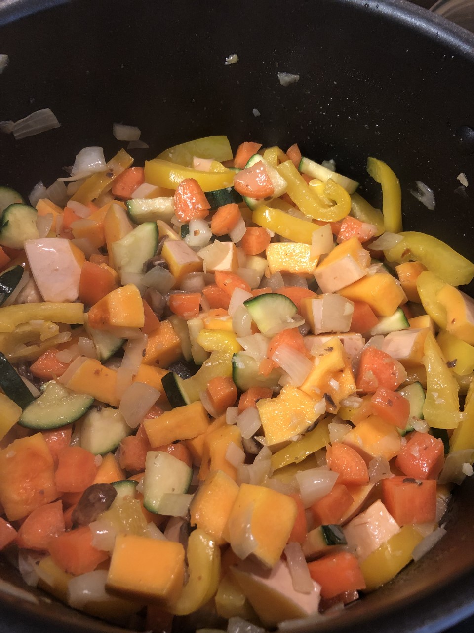- Add the rest of the veg, mix well and cook for 5 mins until it’s starting to soften. – Pic 2