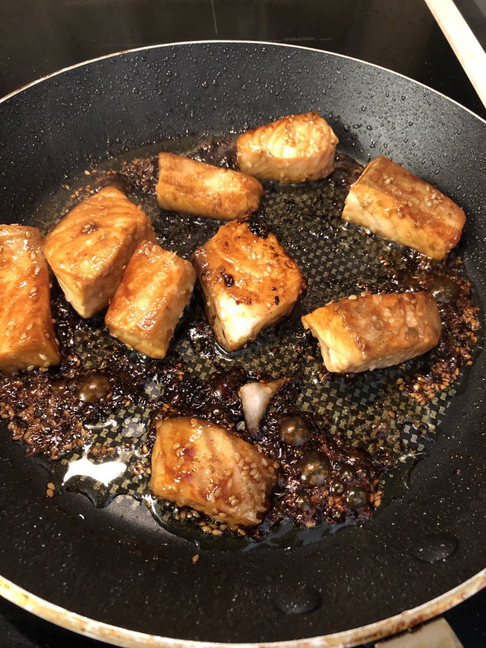 - Remove the veg from the pan and set aside. Keep the pan on a medium heat and tip the salmon, marinade and all, into the pan and cook for 10 mins, turning the salmon over every so often to ensure it cooks evenly. – pic 3