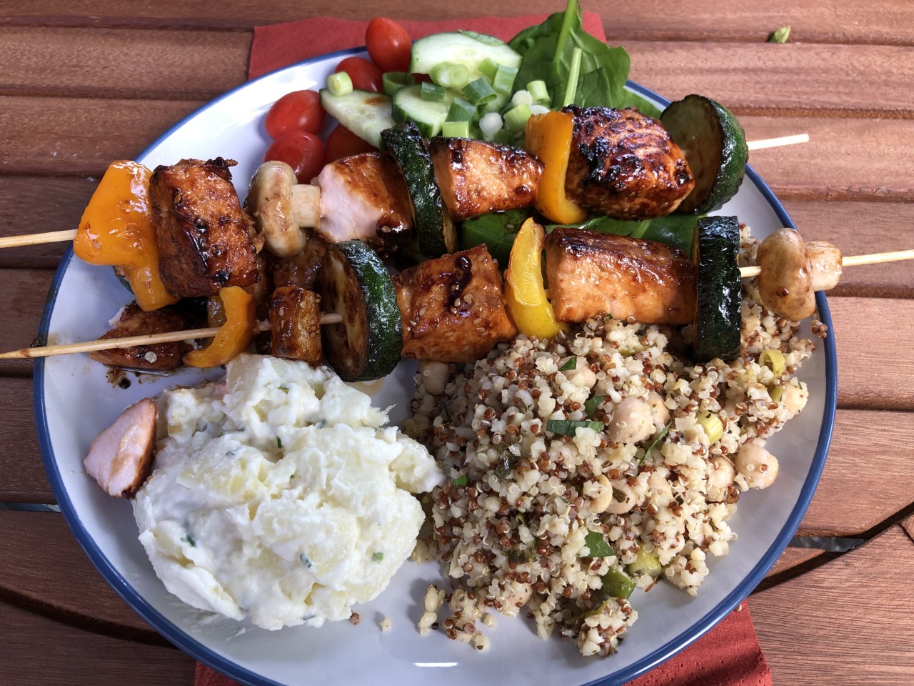 These Teriyaki Salmon Skewers went down really well, even better than the Jerk Chicken ones I made for the meat-eaters. They’re really easy to make and the marinade caramelises in places on the BBQ giving a lovely mixture of textures and flavours. If you’re not using a BBQ, just turn the heat up a little bit on the pan when you’re frying them to get the same effect.
