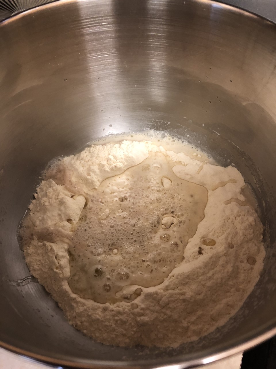 - Put the flour and salt into a large bowl and make a well in the middle. Pour the olive oil, yeast mixture and the rest of the water into the well. – Pic 3