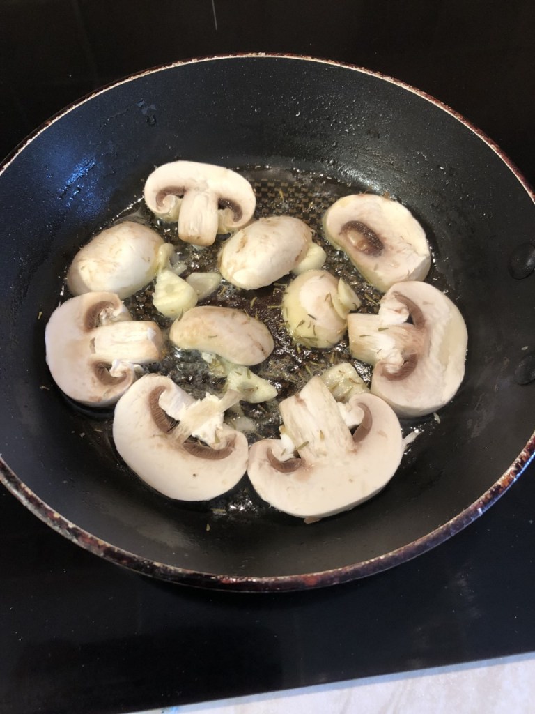 - Put a pan on the hob on a medium/high heat and add the oil, butter, sliced garlic, mushrooms and thyme.