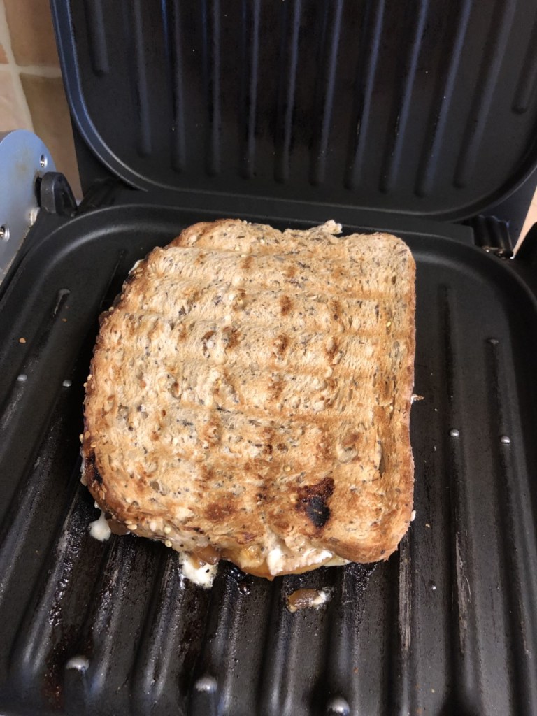- Place the other slice of bread on top and cook until the cheese has melted and the bread is toasted evenly. If using an old George Foreman link me, flip half way through to ensure an even cook.