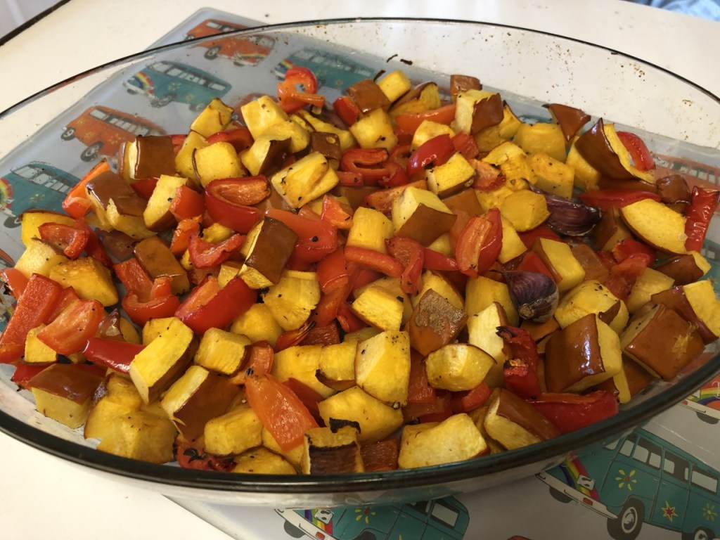 - Place the pumpkin, peppers, garlic, 1 teaspoon of black pepper and 4 tablespoons of olive oil into a large oven-proof dish or baking tray and mix well so all the veg is coated in the oil. – Pic 1