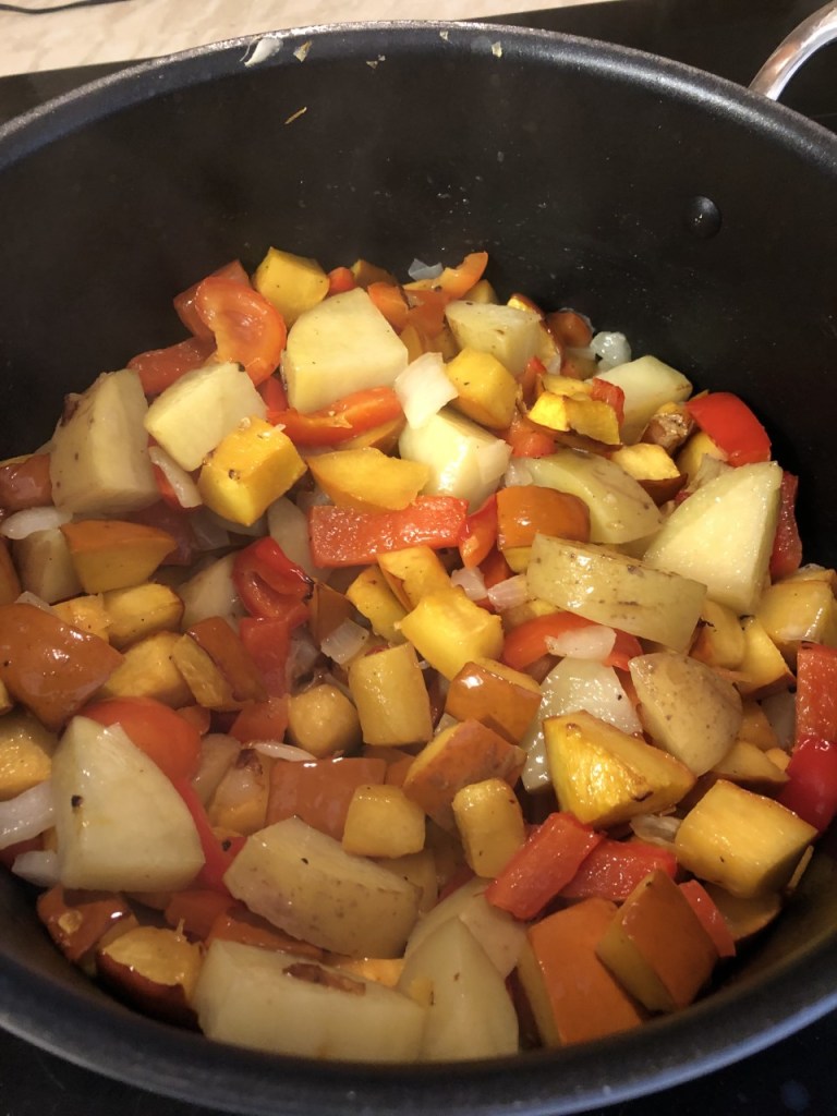 - Cook for 10 mins, stirring regularly until the onions are starting to brown, then add the roasted pumpkin and peppers (not the garlic) – Pic 2
