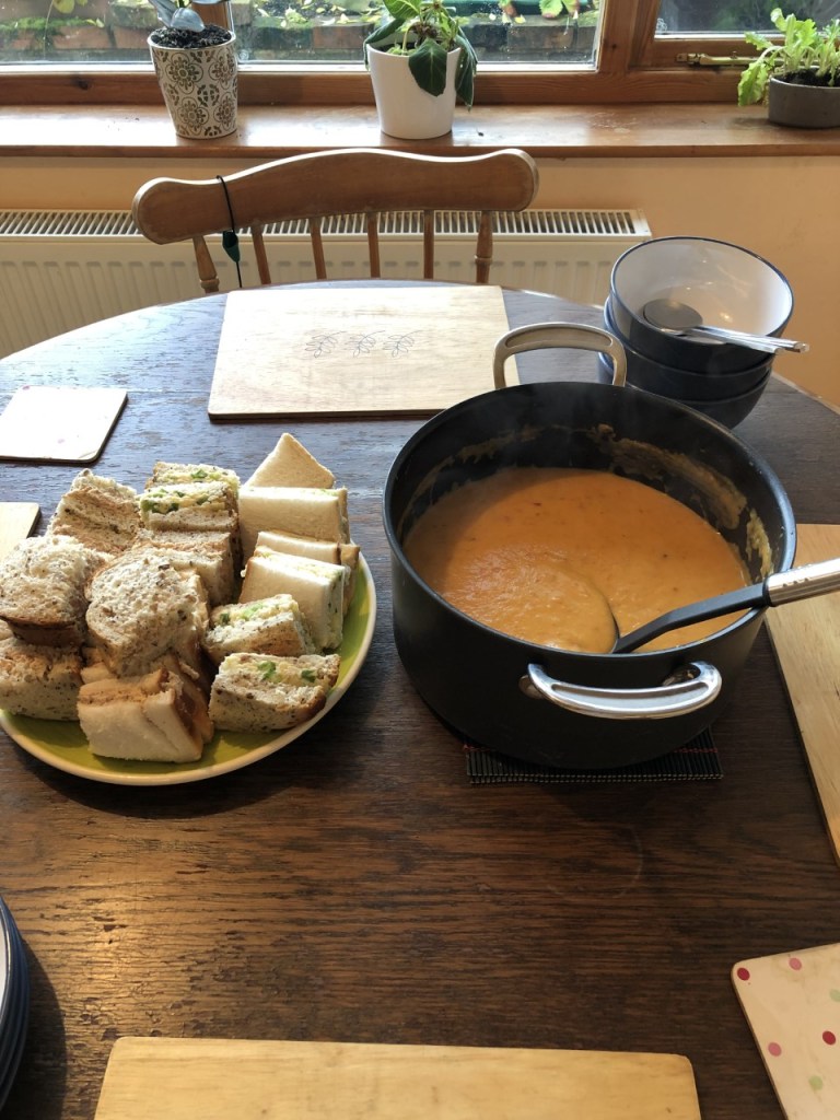 Ready in 90 mins (10 mins prep, 40 mins roasting, 30 mins on the hob, 10 mins blending and reheating) – serves 4-6.