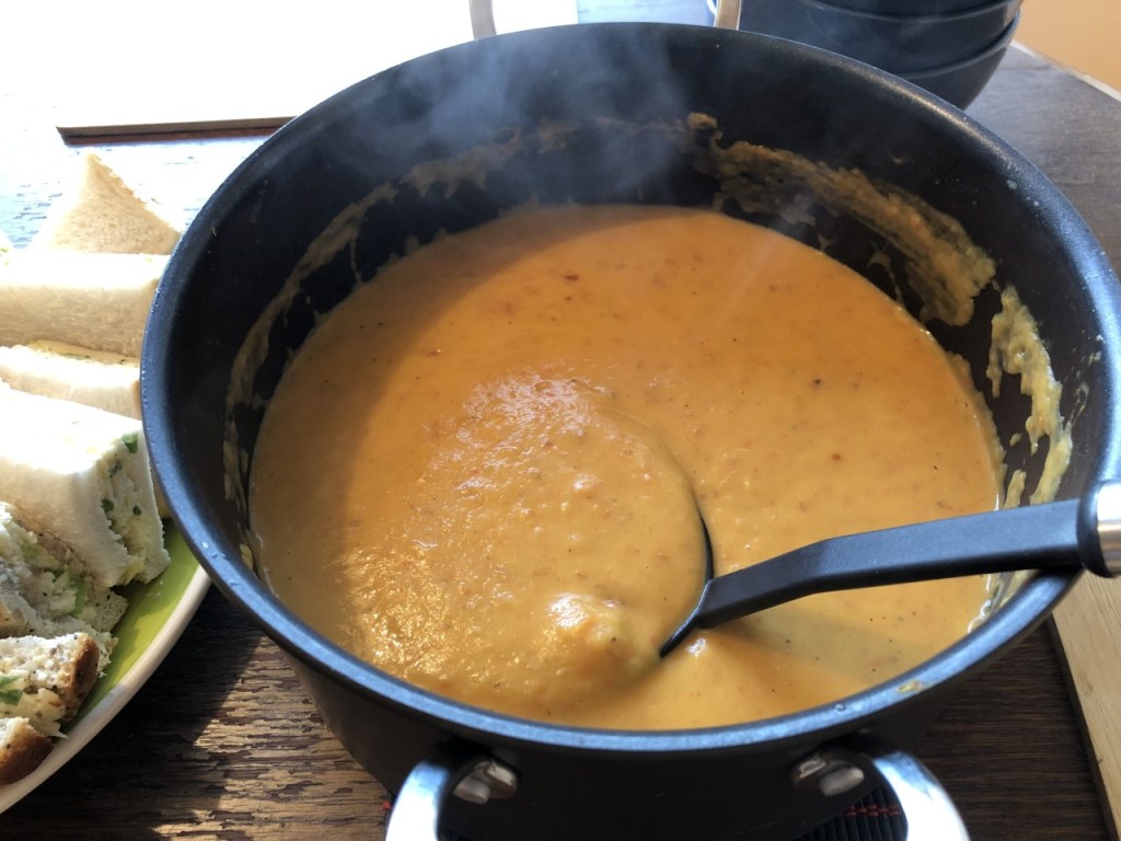 - Return to the pan and heat gently, adding the milk a little at a time until all the milk is combined and the soup is hot, but not boiling. – Pic 5