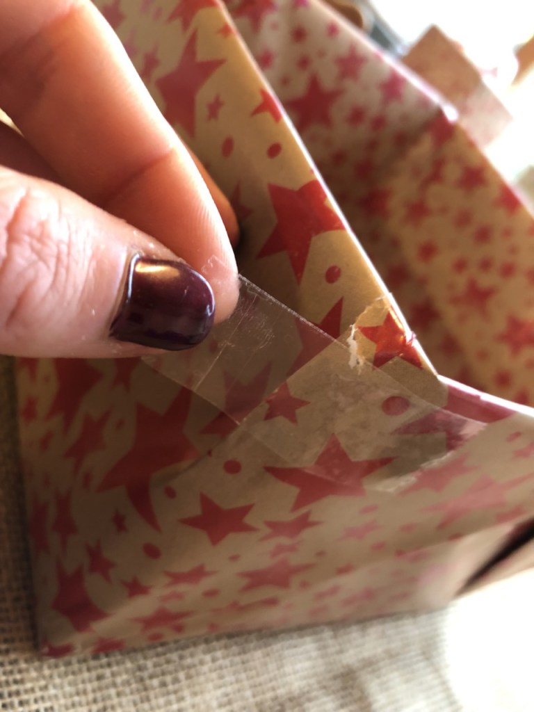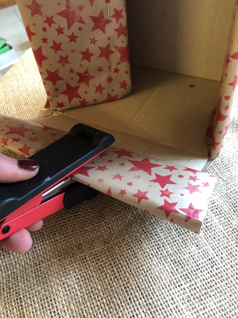Next, focus on one of the sides where the paper isn’t yet secure, and fold the excess paper like you would on a present – the bottom piece up so it lays flush with the box, then one side across diagonally, then the other. Secure with a bit of tape, fold the raw edge over the edge of the flap and staple as before: