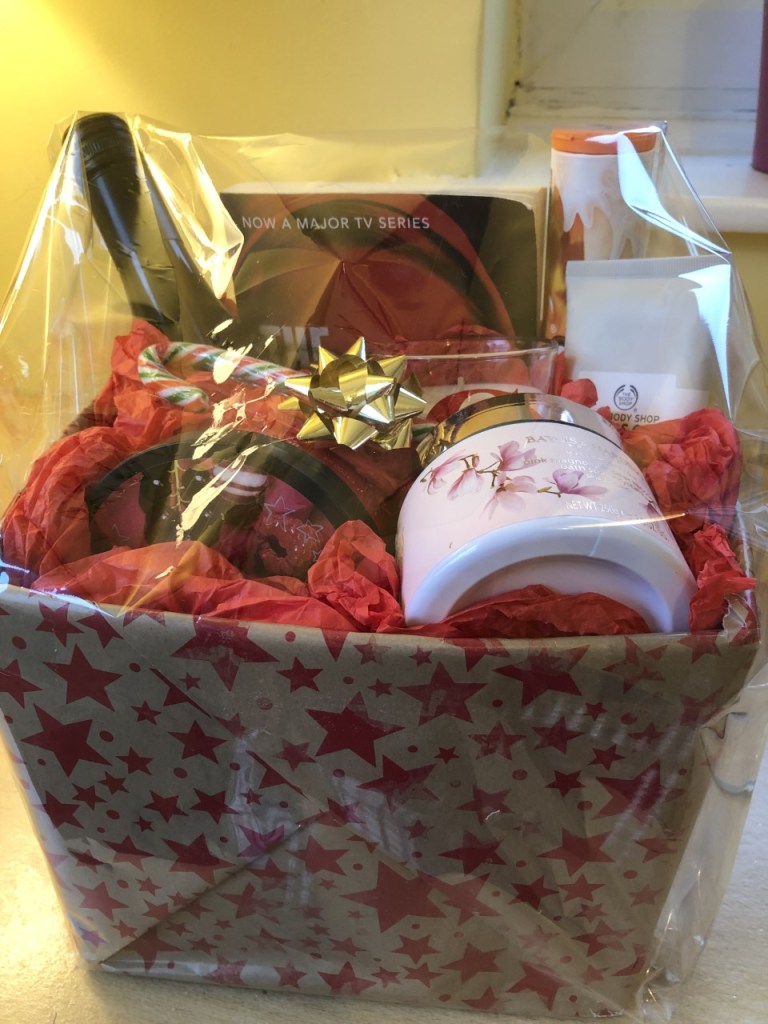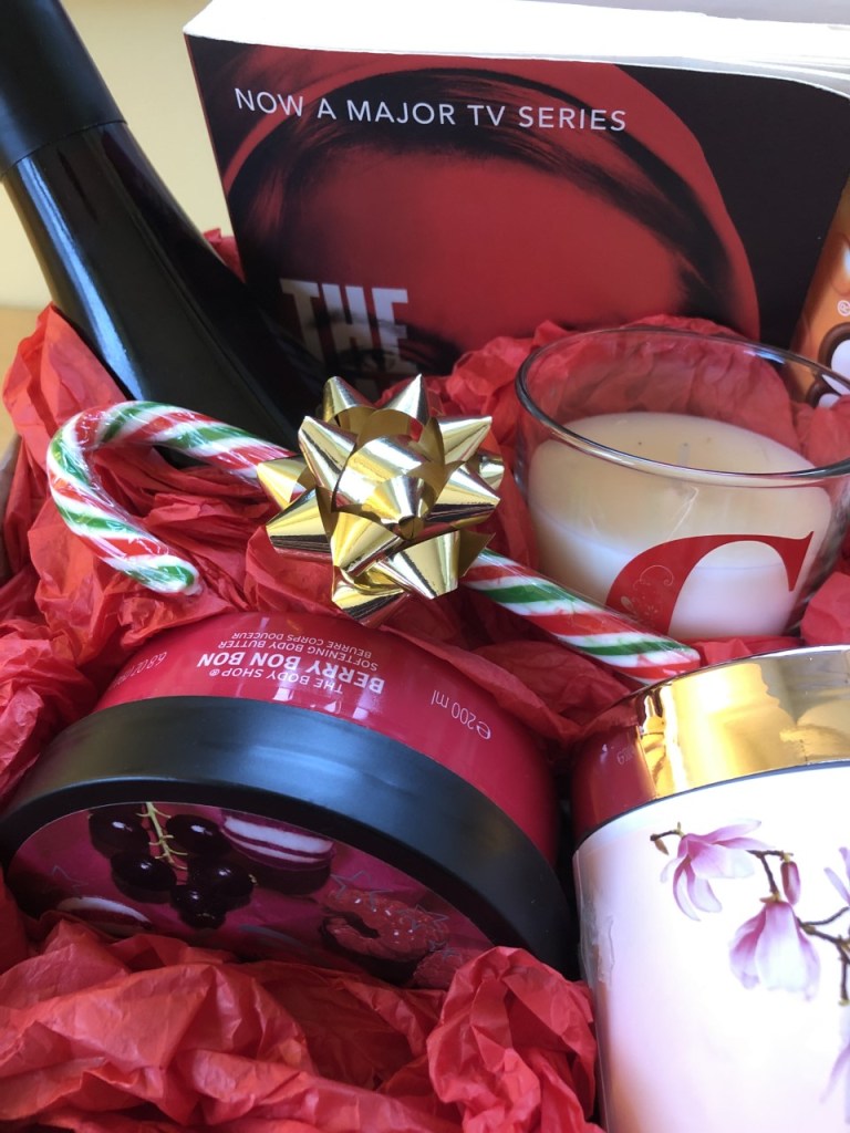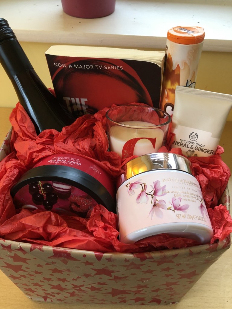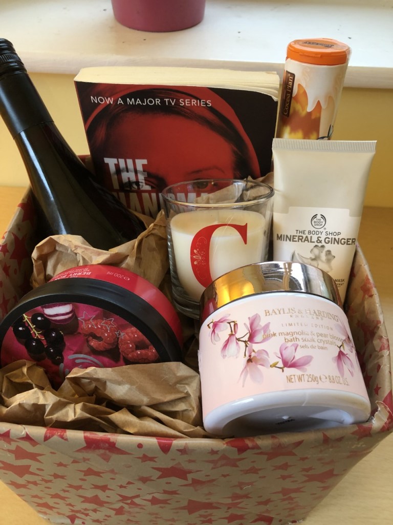 I’ve gathered some items together that would make a great Grown Up Bath Time Treats Hamper – bottle of wine, book, chocolates, smelly candle, bath salts, luxury face mask and body butter.