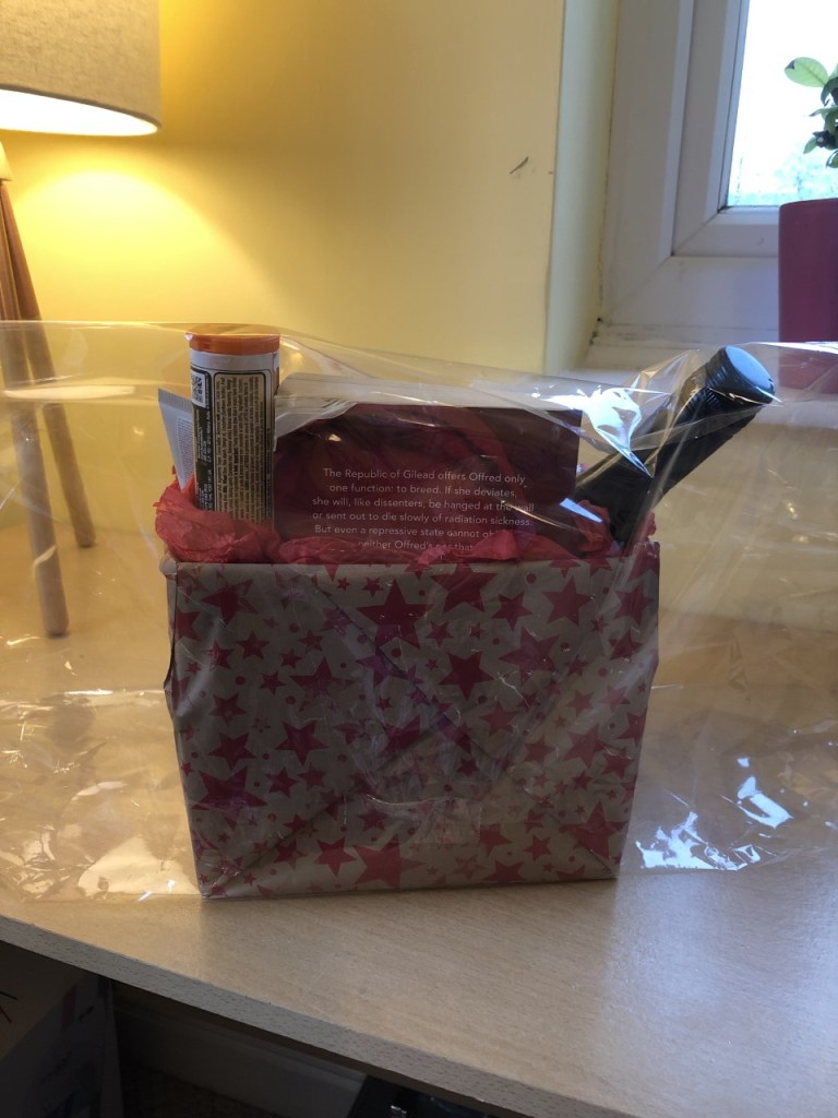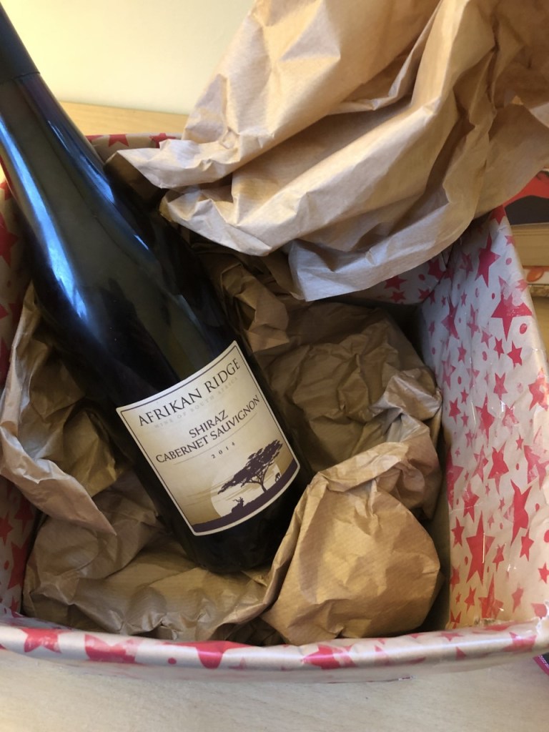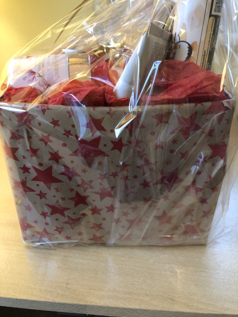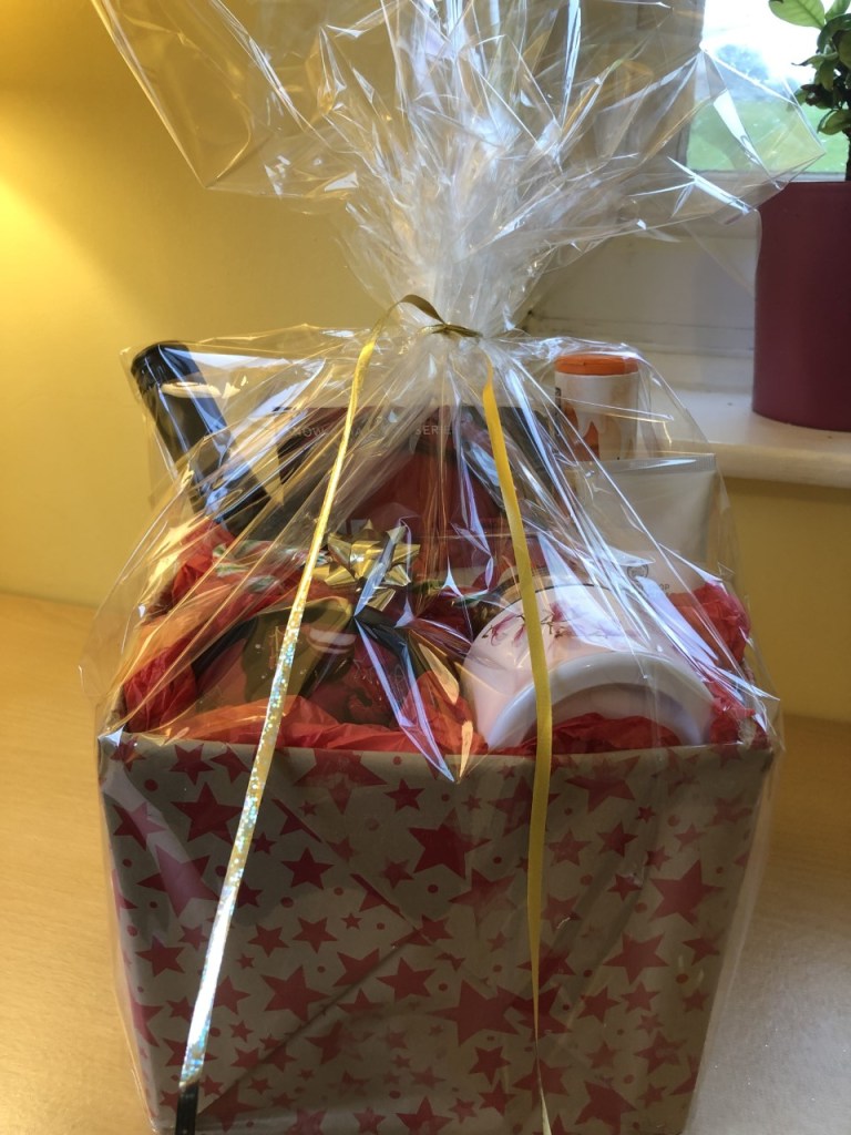 I’ve gathered some items together that would make a great Grown Up Bath Time Treats Hamper – bottle of wine, book, chocolates, smelly candle, bath salts, luxury face mask and body butter.