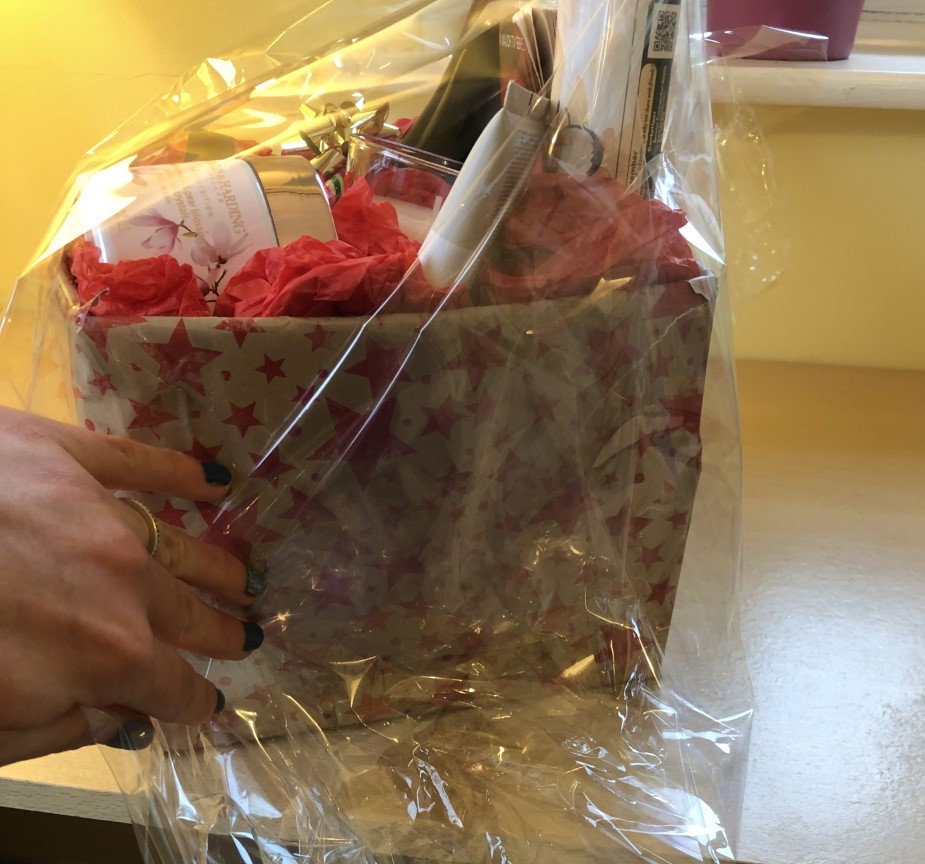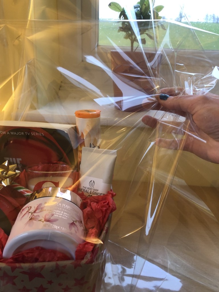 There are two main ways to wrap a hamper – ‘Gathering’ and ‘Up and Over’. The Gathering technique uses more cellophane, but it’s more dramatic. The Up and Over technique uses less cellophane and you can see into the hamper much more, but it is less showy. I’m going to show you both.