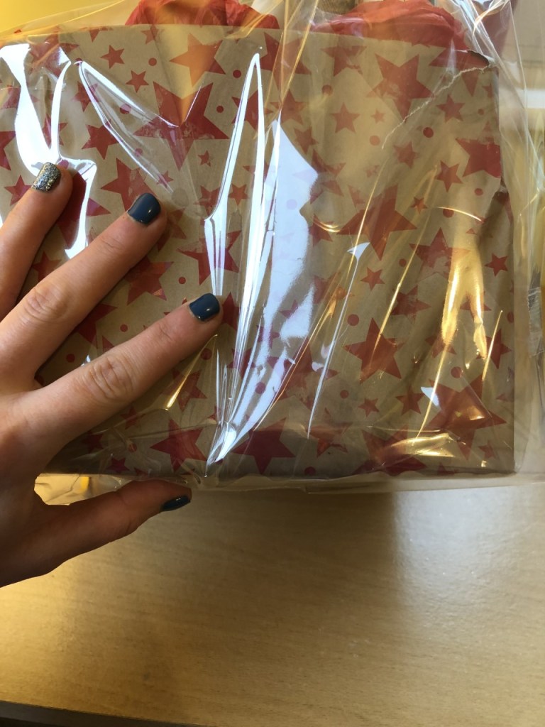 Fold the sides in like a present – push the top bit of cellophane down so it sits flush with the box, then each side diagonally over the top. Trim the left over cellophane at the bottom so it doesn’t go past the top of the box, and pull it upwards and tape it in place: