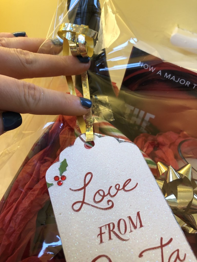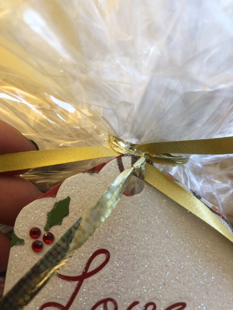 Put a piece of curling ribbon through your tag and tape the ribbon to the cellophane. Cover the tape with a star or bow.