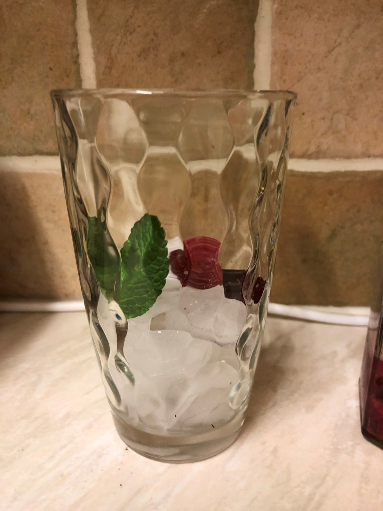 - Half fill a tall glass with ice and the mint and berry garnishes.