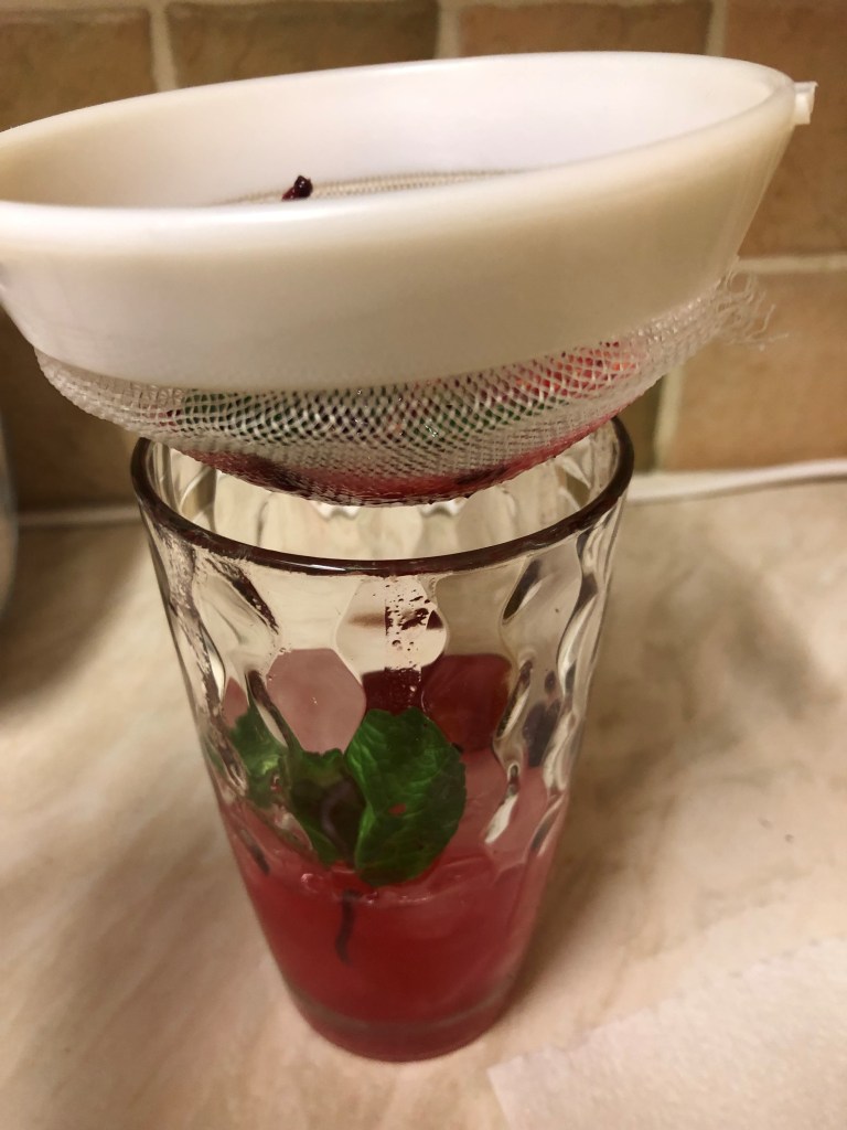 - Crush the berries and bruise the mint with a mudler or spoon, then put the lid on tightly and shake for a minute until well combined: