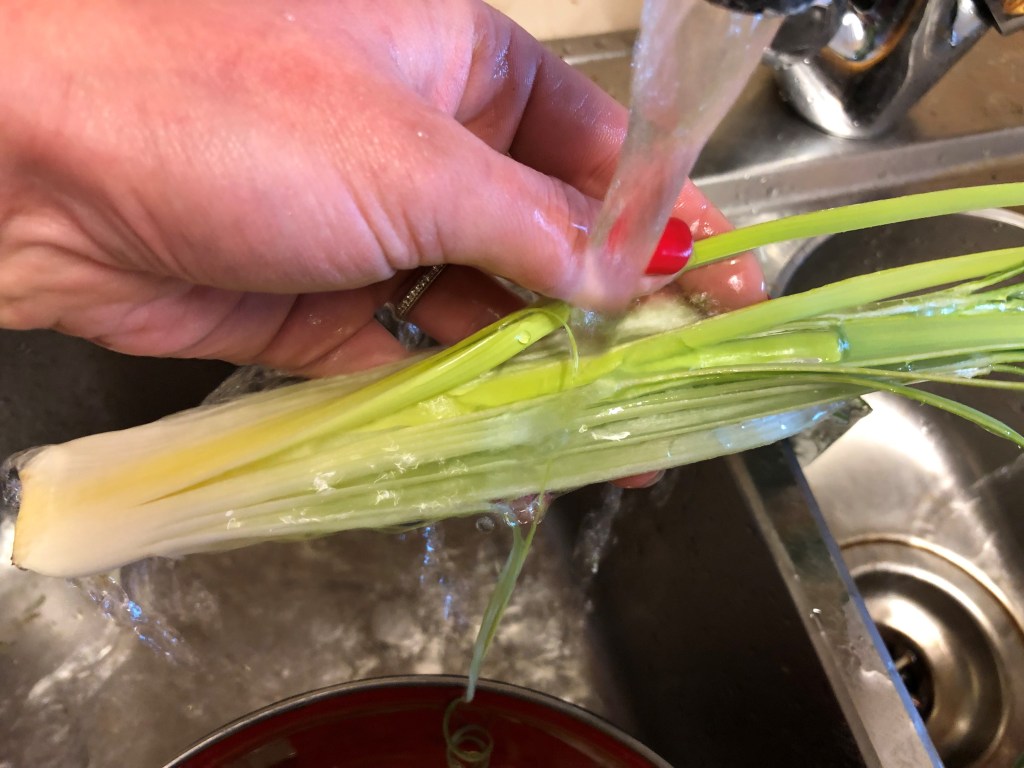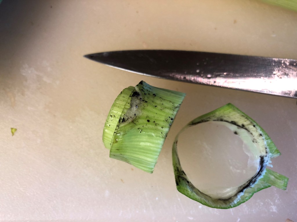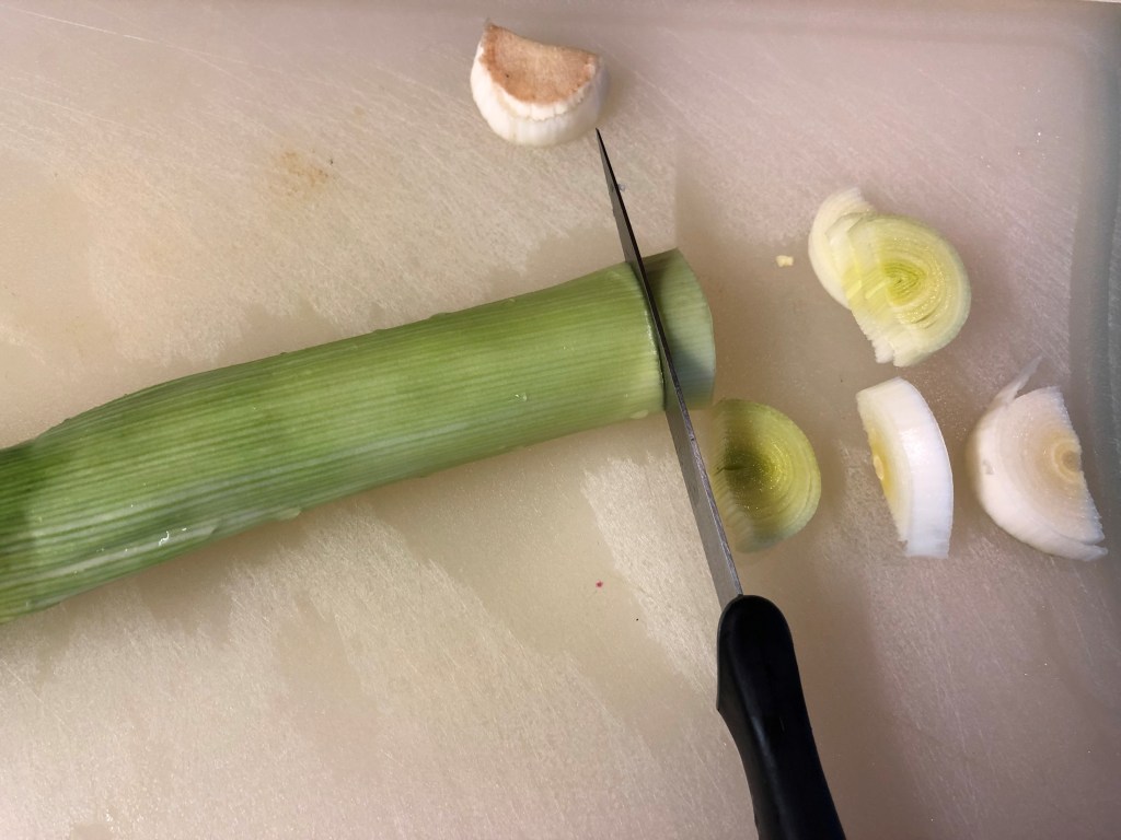 Next time you use a leek, instead of washing it and chopping it into rounds like above (and finding clumps of dirt as you do), slice the entire leek down the middle, length ways, leaving half the root on each side, like below.