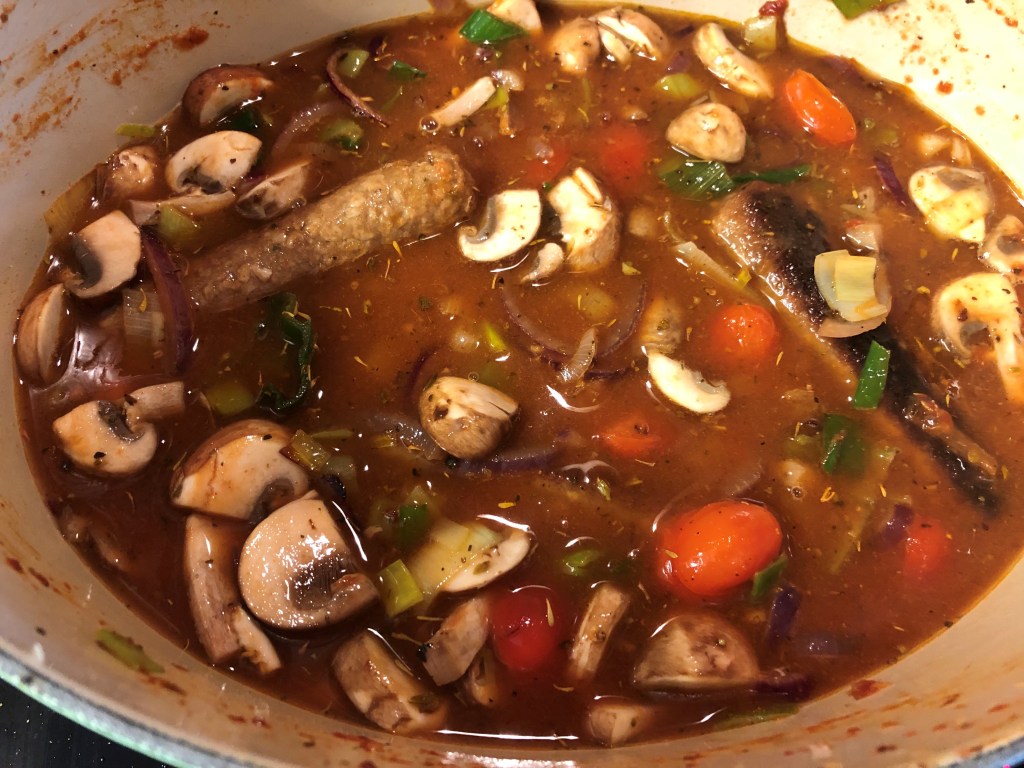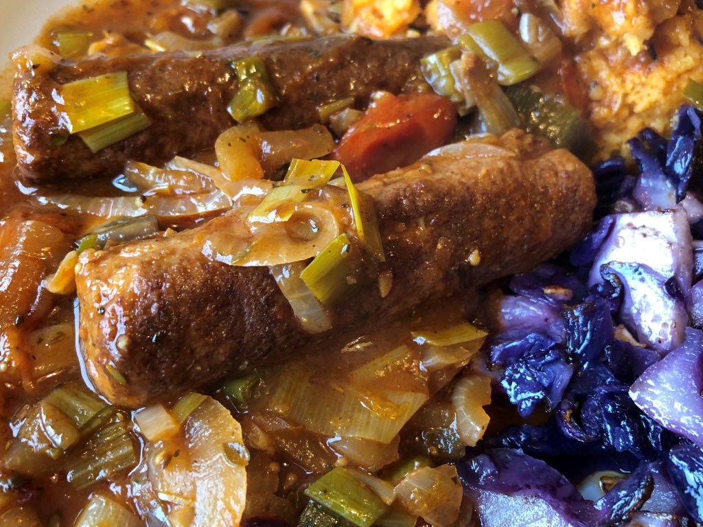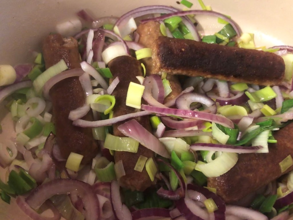 I have spent years developing this recipe. Every winter I give it another go, changing the recipe each time, and each time it was a bit . . . meh. I knew it would work eventually, sausages, leeks, onions, gravy, what can go wrong? Turns out, when you’re using vegetarian sausages, it’s harder than you think to get the balance of flavours right.