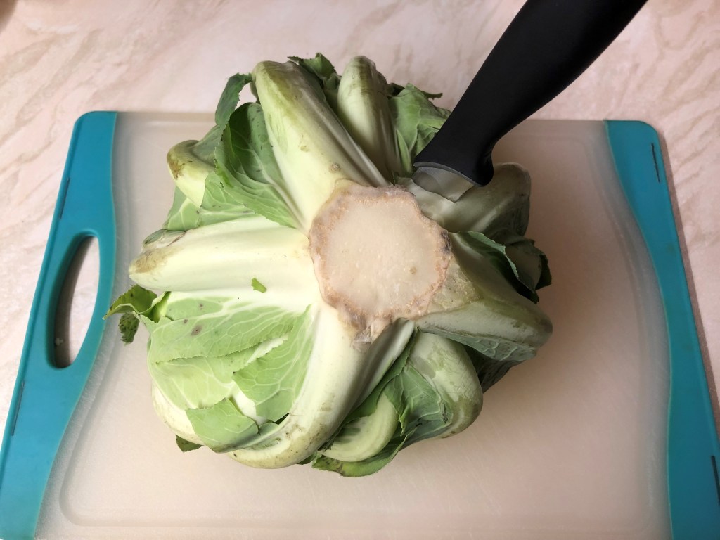 Using a small sharp knife, cut a deep circle into the veg (get the whole blade in there) going around the stalk. As you cut, the leaves will fall away: