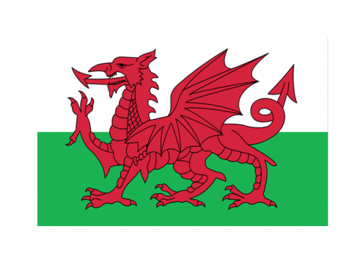 2, The Welsh flag features a red dragon standing on green grass under a white sky.