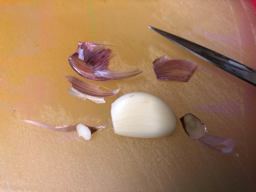 - Place the clove on a chopping board and lay the flat side of a knife on top. Pres the heel of your hand onto the flat knife blade to crush the garlic underneath. Be careful!