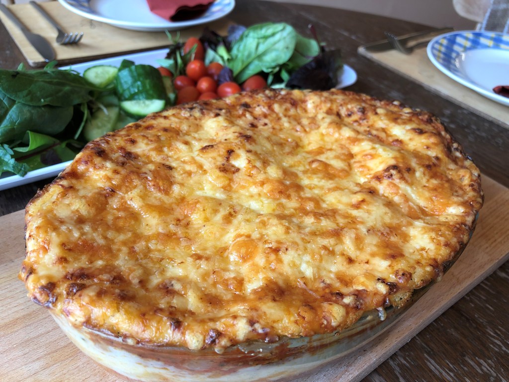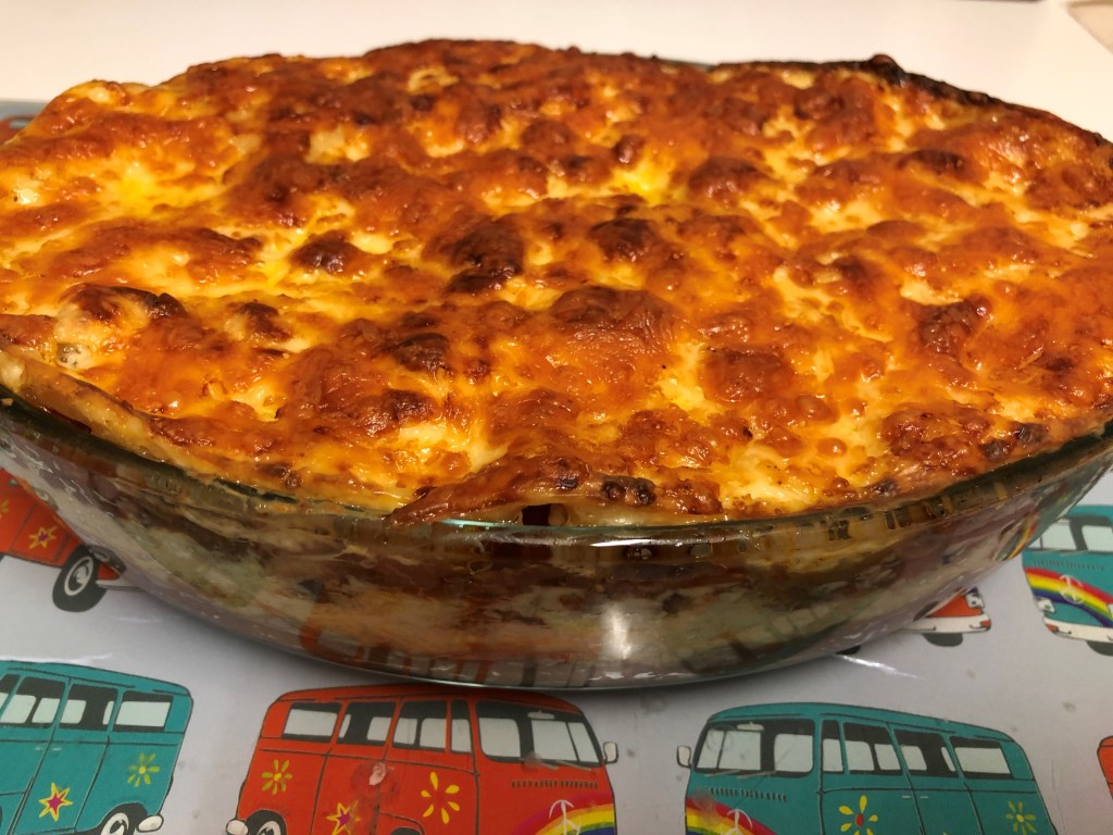 - Sprinkle the 100g of grated cheese on top and bake for 25 – 30 mins, or until golden brown and bubbling. – Pic 13