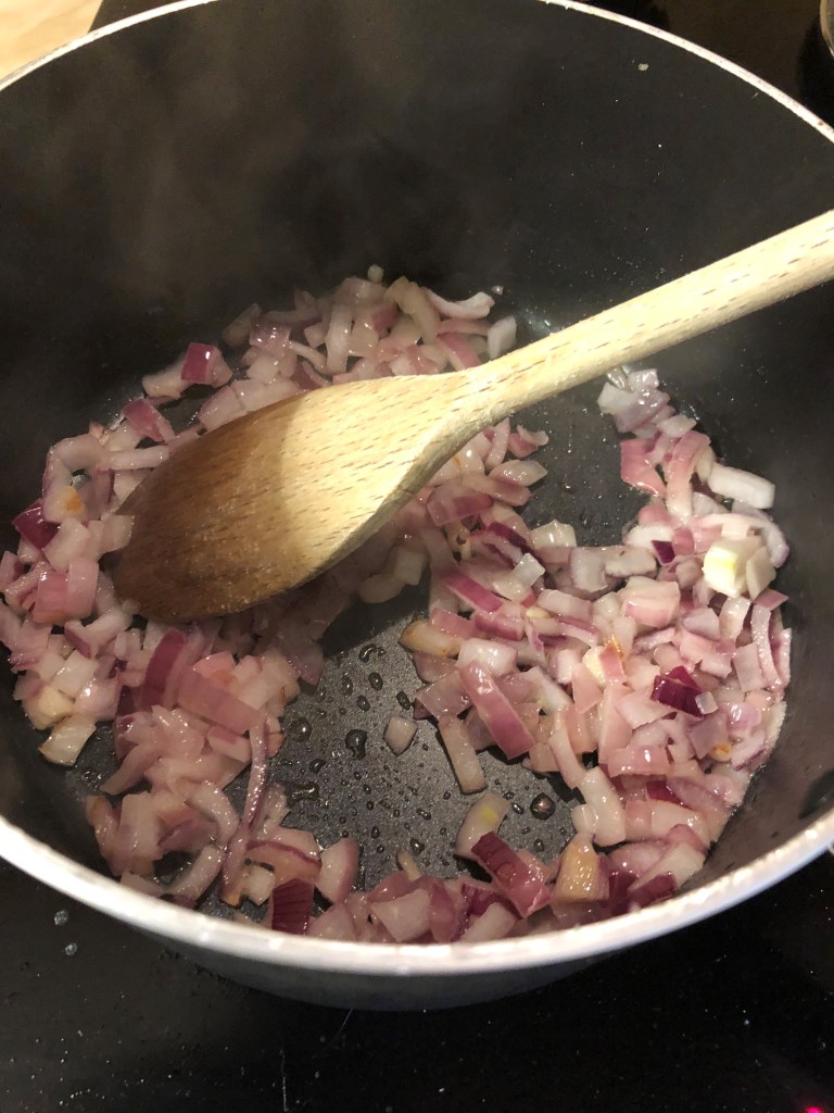 - Put the rest of the oil and the onion in a pan on a medium heat on the hob, cook for a few mins until softened. – Pic 2
