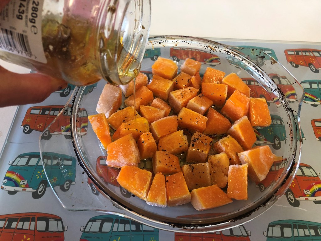 - Put the squash, oil and black pepper in an oven proof dish and roast for 40 mins, mixing and turning half way through. – Pic 1
