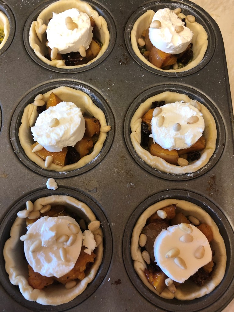 - Divide the cheese up into equal sized chunks, enough for each tartlet and place that on top and sprinkle a few pine nuts over each one. – Pic 6