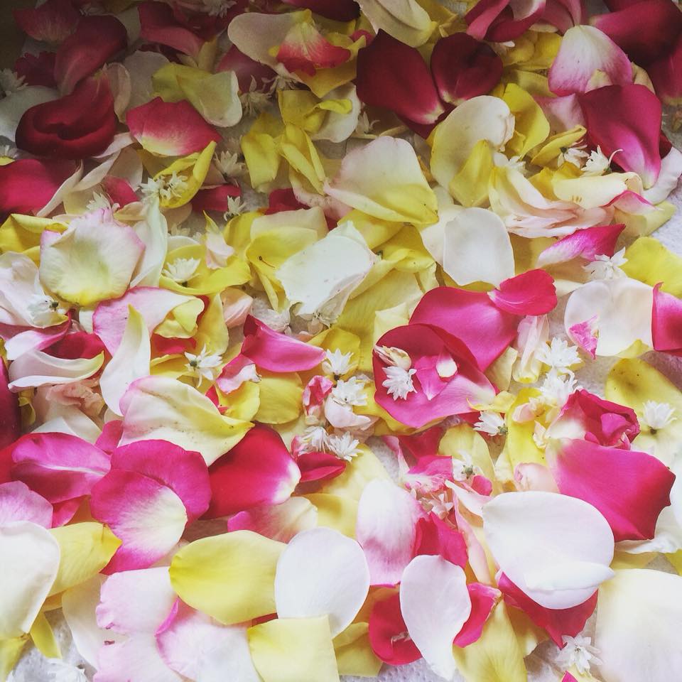 Spread your petals out in a single layer in a cardboard box or crate with kitchen roll or newspaper in the bottom. This will help the drying process by drawing the moisture out of the petals.