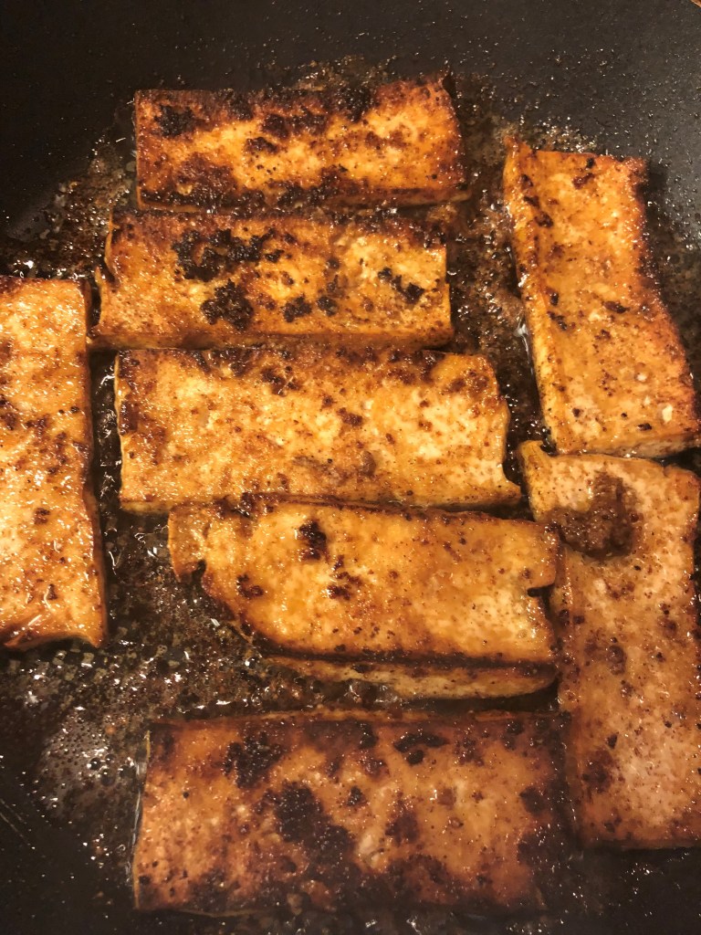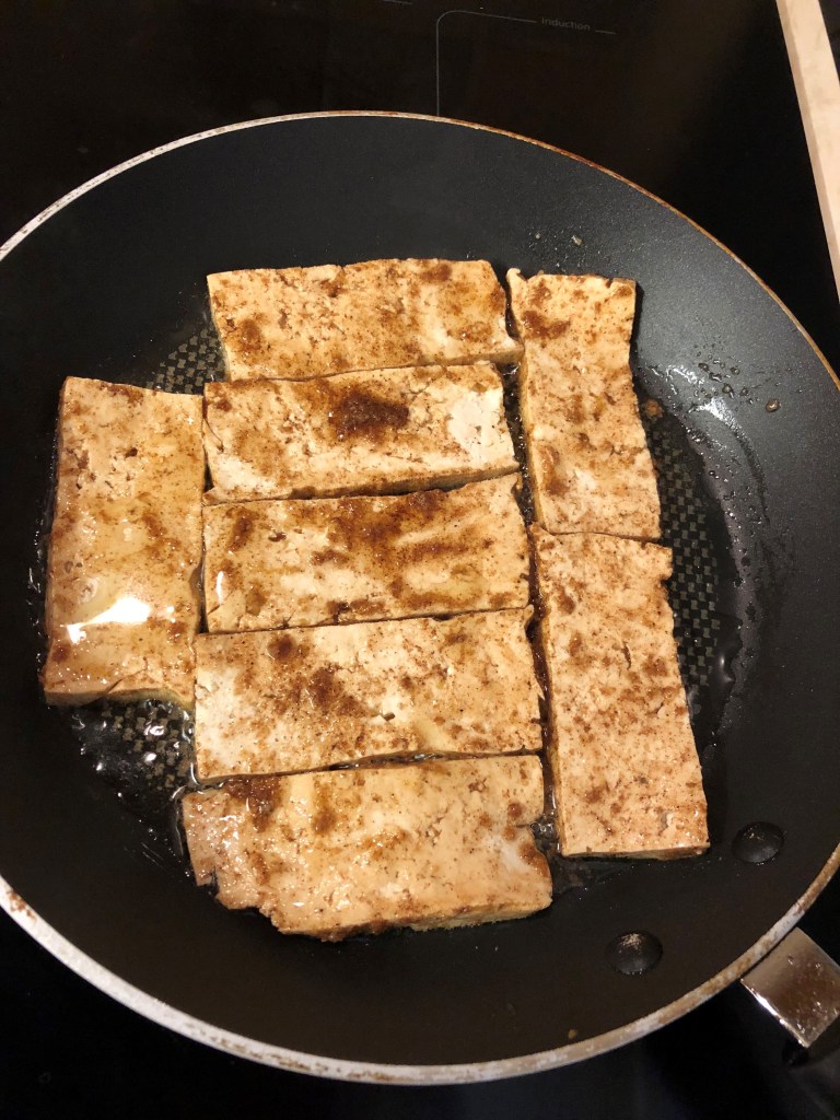- Heat a large frying pan up to a medium heat on the hob and cook your marinated tofu for about 5mins on each side until they start to crisp at the edges. Pour all the the marinating sauce in the pan, you want to keep all those lovely flavours.