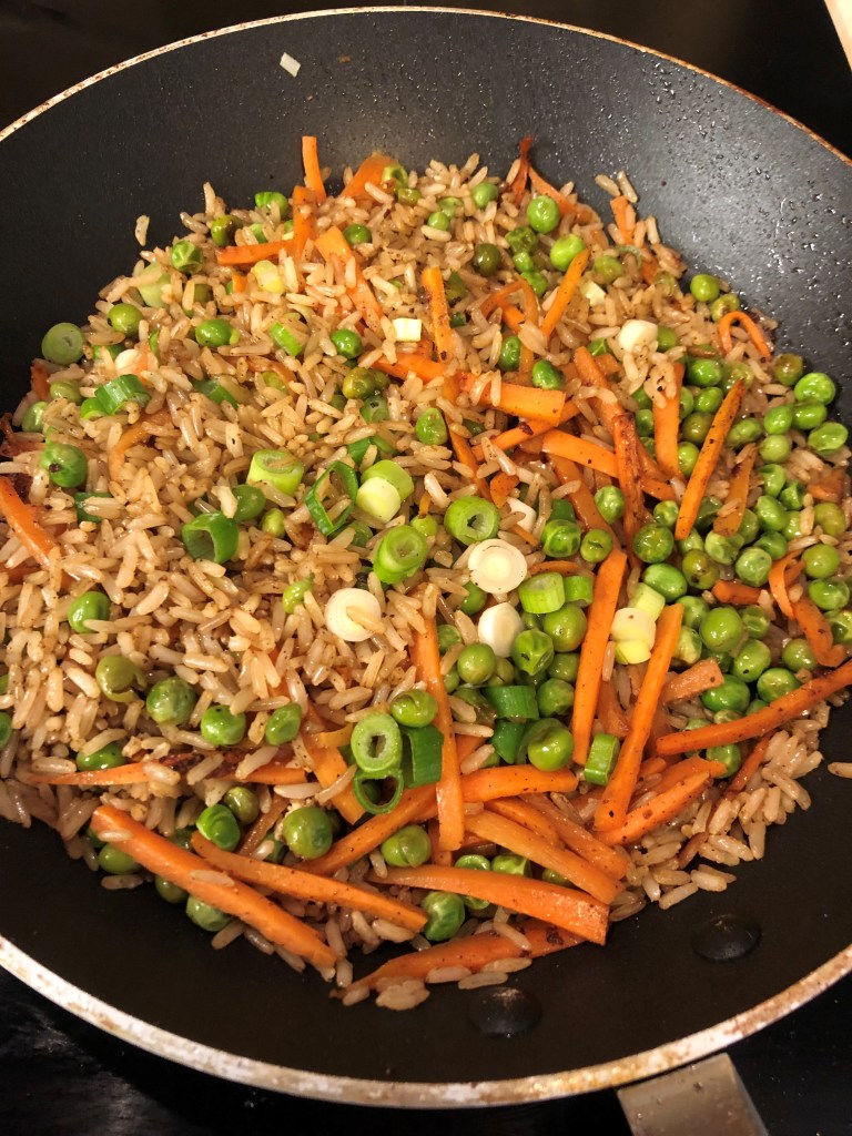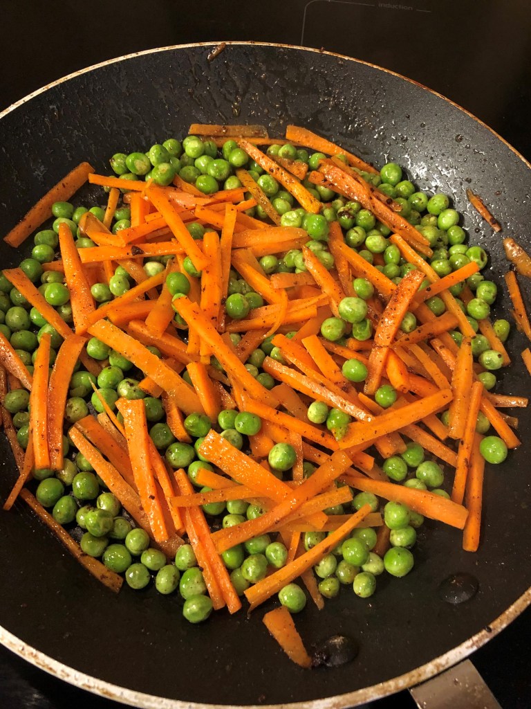 - Keep the frying pan on the heat and add the carrot and peas. They will soak up all the lovely sauce that’s left over from the tofu.