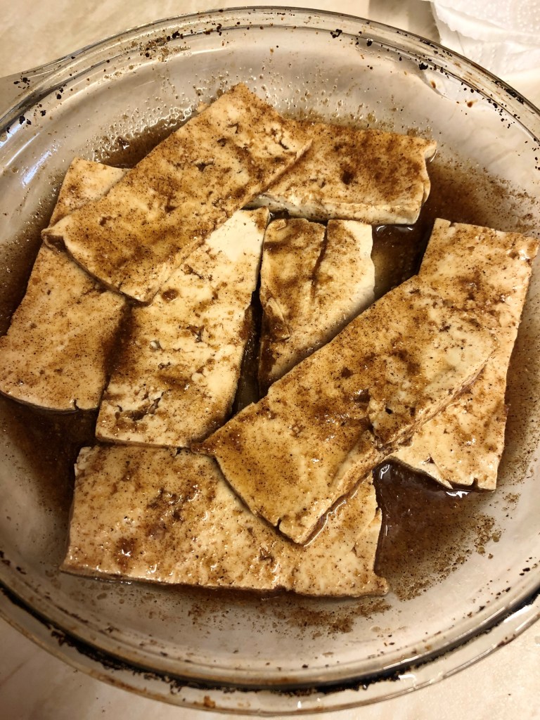 - Add the tofu, coat well, cover and marinade for about 30 mins.