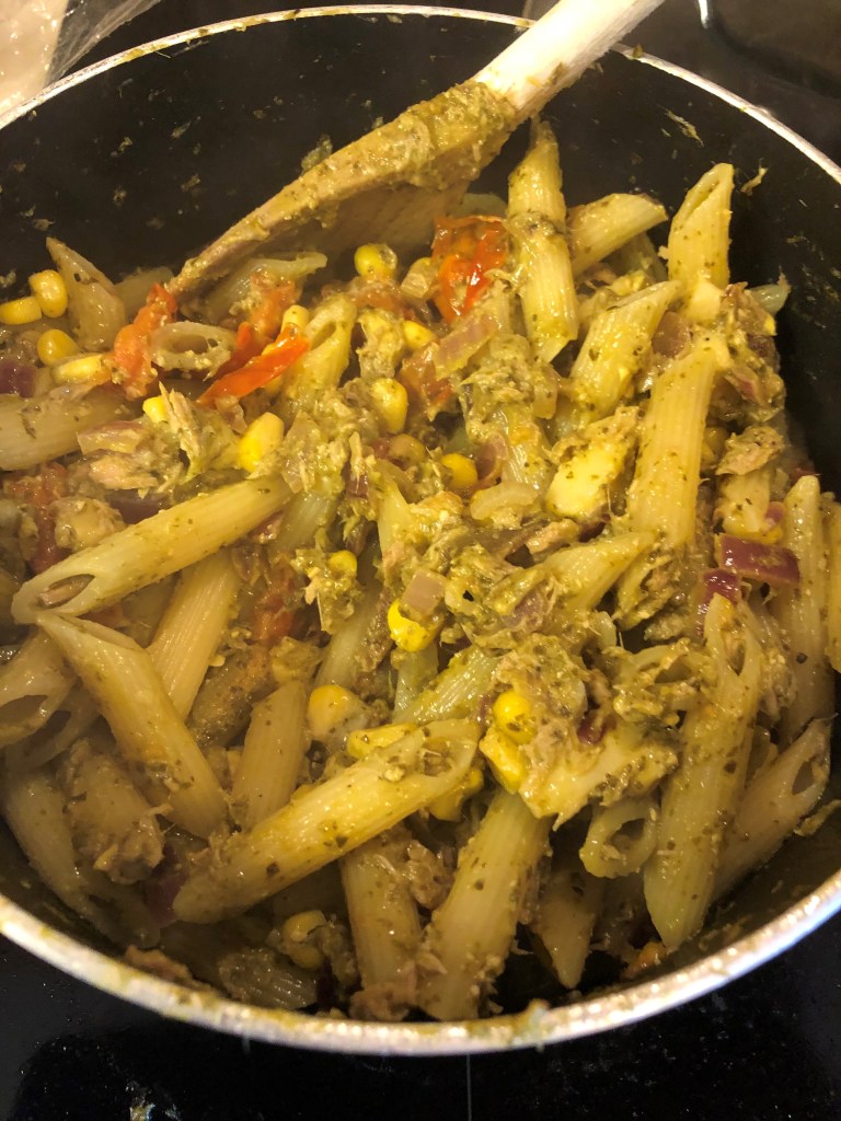 - Add the tuna, pasta, pesto, black pepper and paprika and mix well. – Pic 3