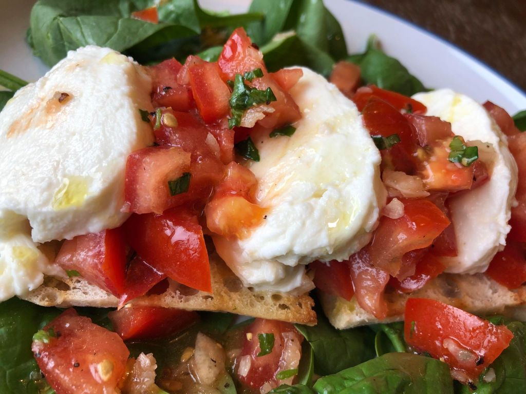 I was introduced to bruschetta on that holiday too, and have served it many times since as a starter or as a canape at parties. This time however, I decided to combine the two much-loved dishes, and created my Caprese Bruschetta. It makes a perfect lunch served simply with a handful of spinach and only takes a few minuets to make. It tastes fantastic and is ‘easy-caprese’ to make. . . Sorry.