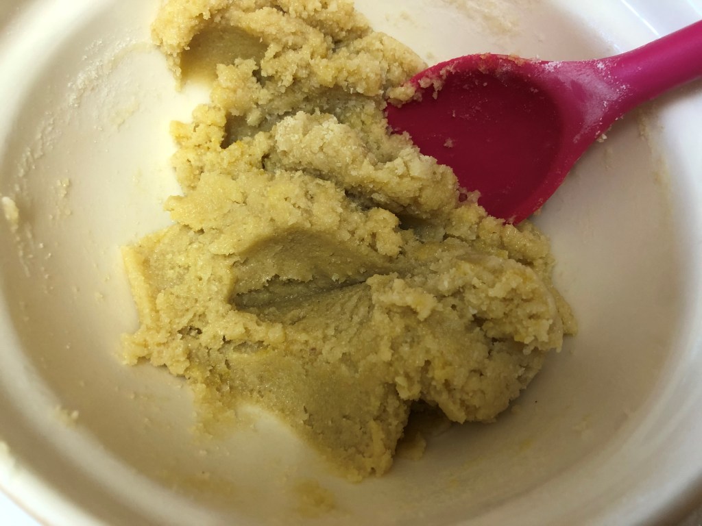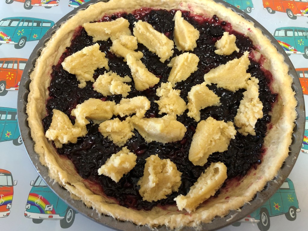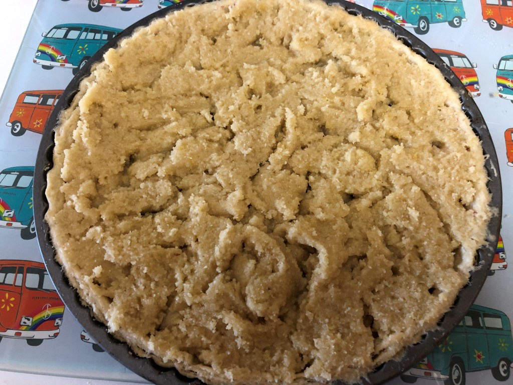 • Spread the jam over the bottom of the pastry case and spread the frangipane on top. I find it’s easiest to place small amounts of frangipane all over the jam, then mix each dollop of frangipane into each other, or you may end up mixing the jam into the frangipane instead of keeping them seperate.