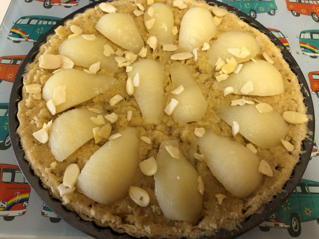 • Arrange the pear slices on top of the frangipane, pushing each peace into the frangipane slightly.