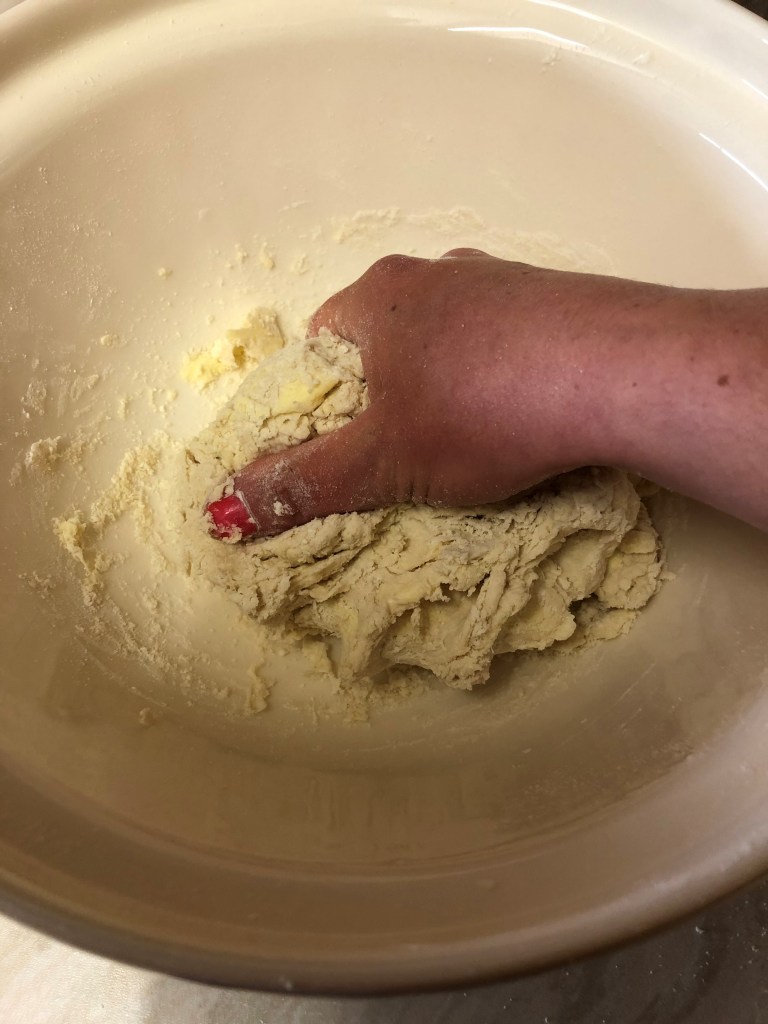 • Add the cold water and mix it in using the blunt knife, then bring it together with your fingers to form a ball of dough.