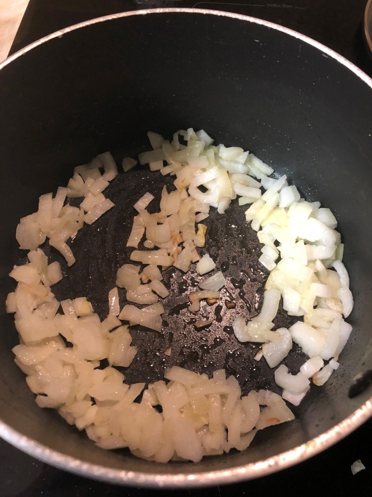 - Put a pan on a medium/high heat on the hob and add a tablespoon of olive oil and the diced onion.