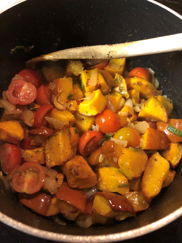 - Cook for a few mins, then add the cherry tomatoes, 250g of the roasted pumpkin, lemon juice, sage, oregano, nutmeg and a pinch of black pepper.