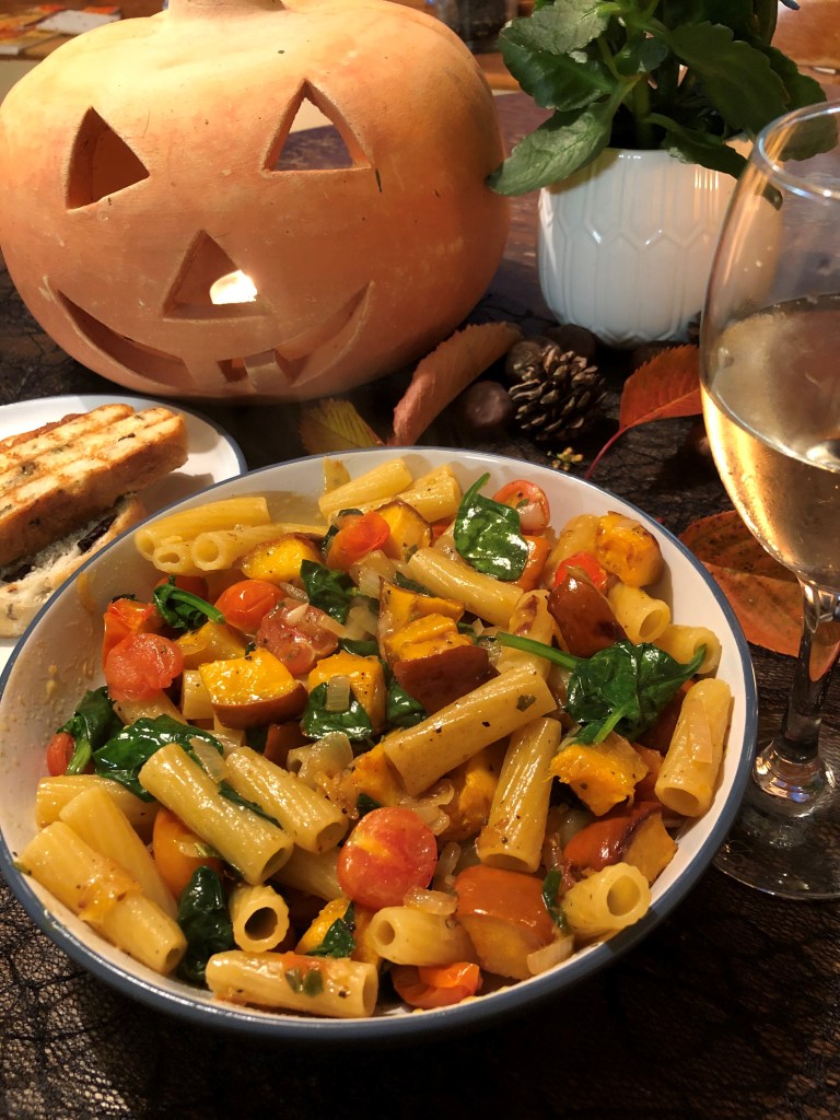 My inspiration for this dish came from a recipe I came upon by chance on Pinterest quite a few years ago. The recipe was Pumpkin, Spinach and Walnut Spaghetti by a blogger called Lazy Cat Kitchen. It was a simple recipe – just lemon juice and zest, chilli flakes, garlic, salt and pepper to accompany the title ingredients, but it looked and sounded like Autumn in a bowl, I had to give it a go. I made it a couple of times, and though it was really easy and quick to make, I felt the flavour lacked a little depth. I know some people prefer simpler flavours, and that’s absolutely fine, but if you’re a regular follower of Pesky Recipes, you’ll know that I like deep, complex flavours and textures in my dishes and I like to use plenty of herbs and spices. So I started playing around with the recipe, adding a Pesky twist to it, and this is the result. I’ve added cherry tomatoes, sage which goes so well with roasted pumpkin, oregano and nutmeg to give it a warm, aromatic, autumnal flavour; and instead of mashing up my pumpkin like she does in the original recipe, I leave mine chunky, which I think adds to the overall look. I love it, it’s comforting, filling and delicious – the perfect tonic to a cold, wet October night.