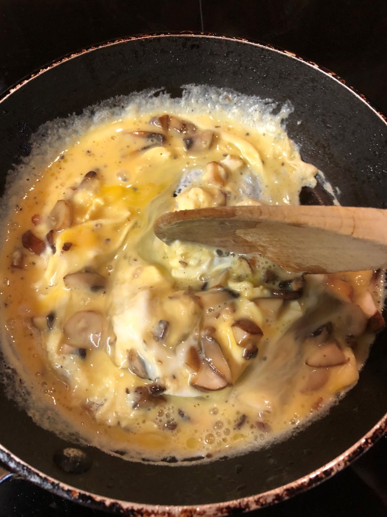 - Once the mushrooms have coloured slightly on all sides, add the egg mixture.