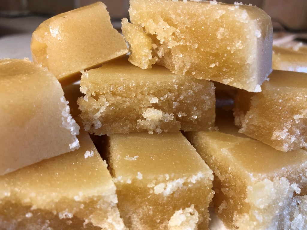 - Once cool, tip the Sugar Sweets out of the tin, peel off the grease proof paper and cut into small pieces. They can be eaten now, but will be very crumbly, they’ll harden a bit more if left overnight.