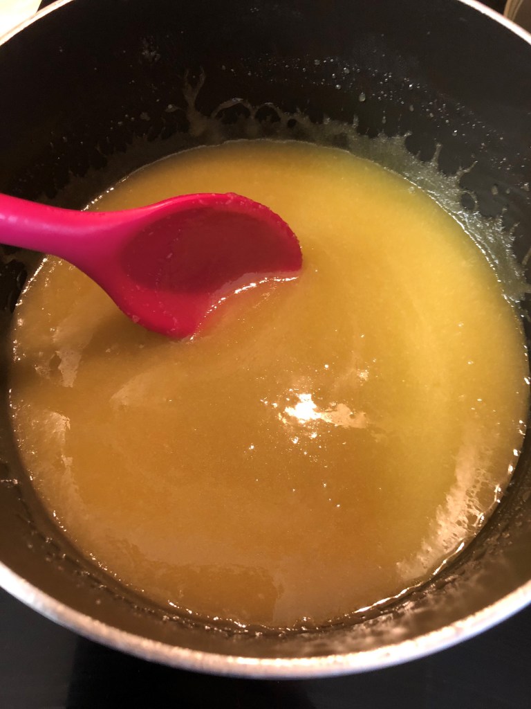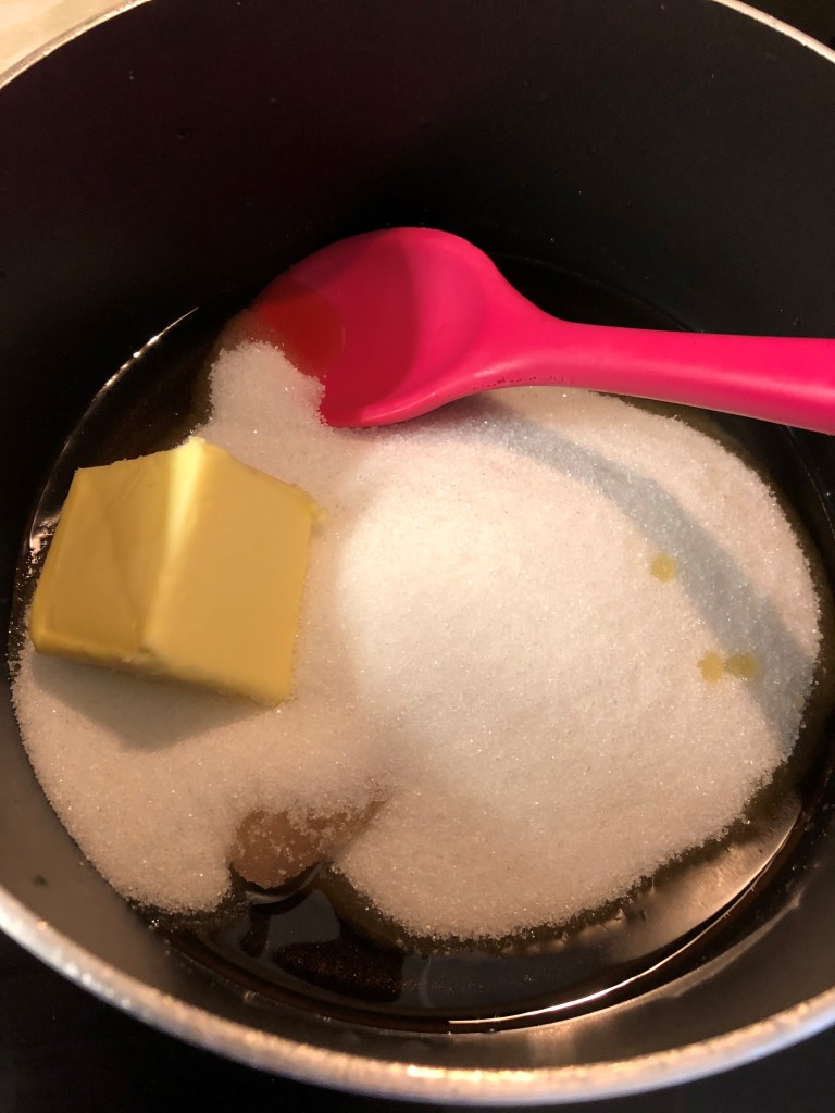 - Heat slowly, mixing all the time until the butter is melted and all the sugar has dissolved.